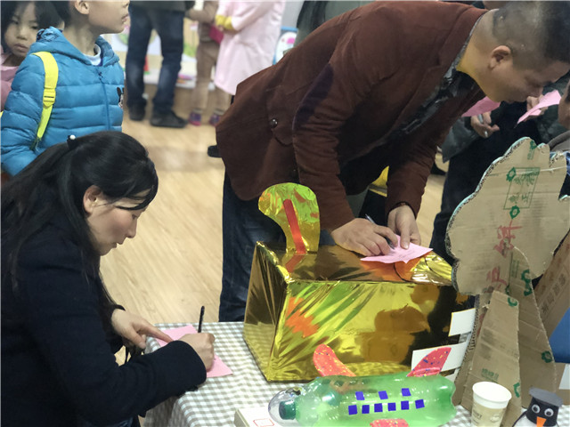 在活動的最后一周,老師組織了全園家長、幼兒對參賽作品進行投票,選出他們心目中最佳的手工作品?,F(xiàn)場,家長和小朋友們都仔細觀摩,對每一件作品細細觀察、認真記錄,力求投出最公正的一票。