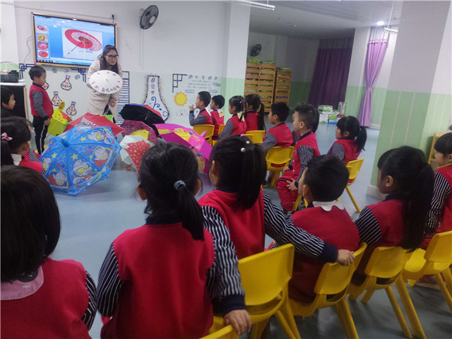 雖然小朋友在生活中見過各種各樣的傘,卻不知道傘是怎么做出來的,我們的助教老師帶來了很多不同材質(zhì)的傘,并對(duì)它們進(jìn)行了詳細(xì)的介紹。特別是在介紹油紙傘時(shí),小朋友都發(fā)出了驚嘆的聲音,紛紛圍觀!