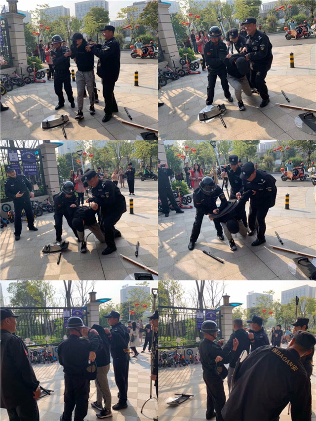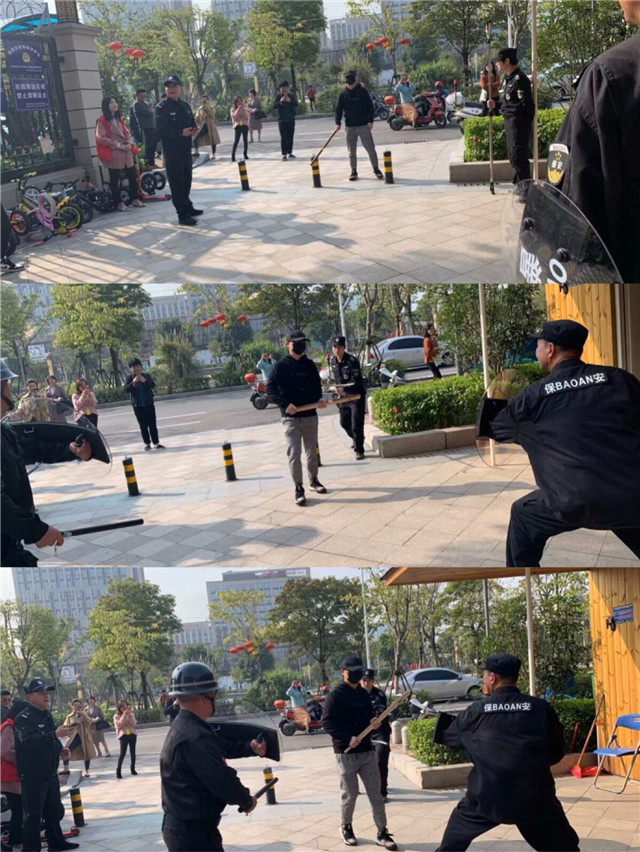 與此同時(shí),幼兒園警戒保衛(wèi)組成員緊急行動(dòng),手持棍棒、鋼叉等器械,將“歹徒”圍住,臨危不亂地與“歹徒”交涉、周旋,牽制“歹徒”,不讓“歹徒”接近幼兒,竭力保護(hù)全園師生安全。