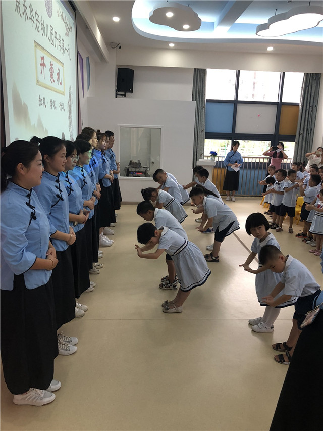 知禮,教師和幼兒代表上臺展示了漢禮;學(xué)禮,小朋友們一起向師者學(xué)習(xí)禮儀;行禮,正衣冠,行拜師禮。看著小朋友們一張張稚嫩可愛的笑臉,老師們都備受鼓舞,大家對即將開始的新學(xué)期充滿了期待。