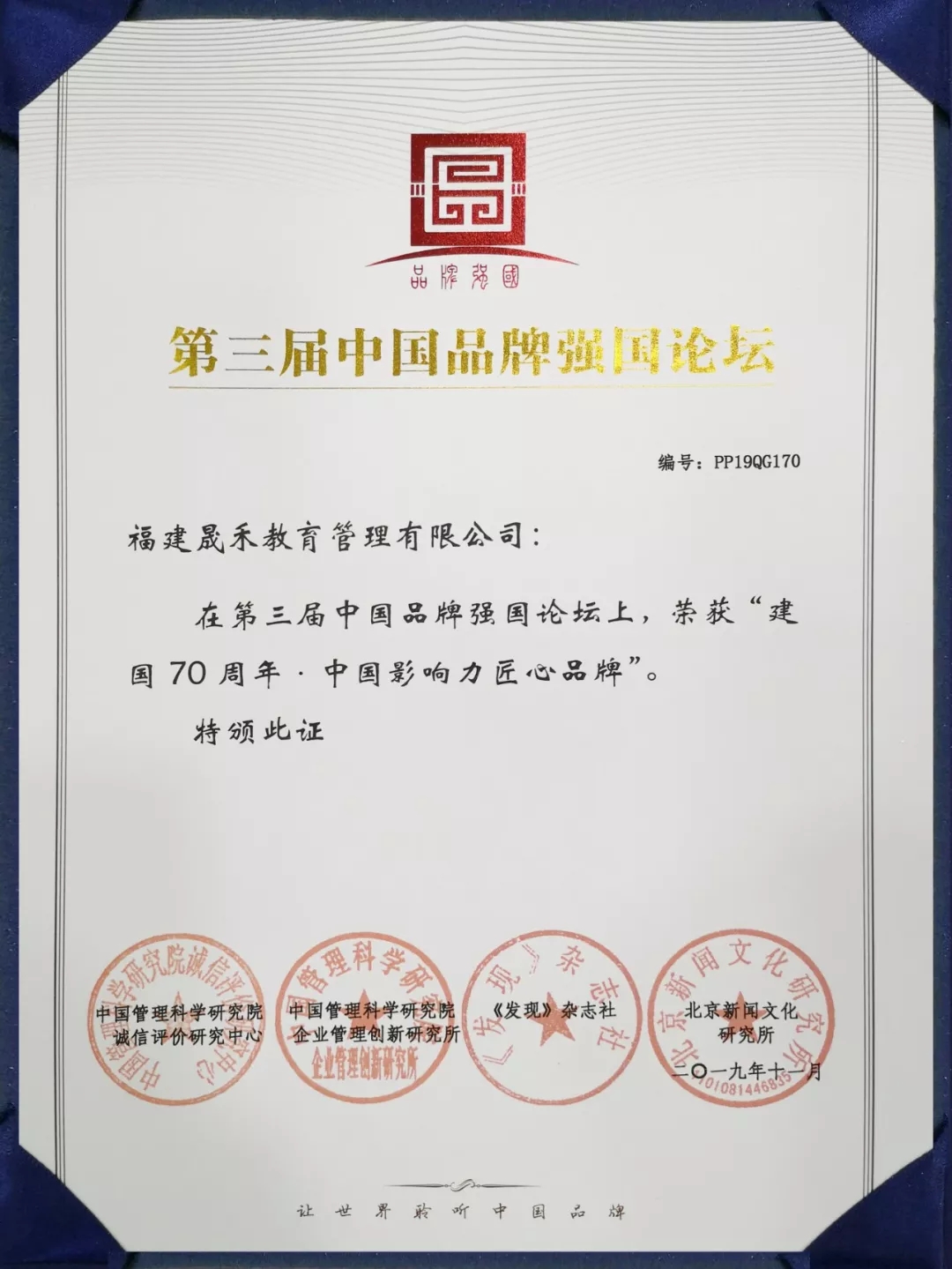 踐行企業(yè)家精神,開創(chuàng)品牌價(jià)值新時(shí)代。近年來,晟禾教育集團(tuán)在推動行業(yè)發(fā)展、品牌建設(shè)及品牌宣傳等方面取得了突出成績,經(jīng)有關(guān)部門推薦及評審委員會審議,福建晟禾教育管理有限公司榮獲“建國70周年·中國影響力匠心品牌”稱號,晟禾教育集團(tuán)董事長鄭炳榮先生被評選為“2019品牌中國誠信人物”。