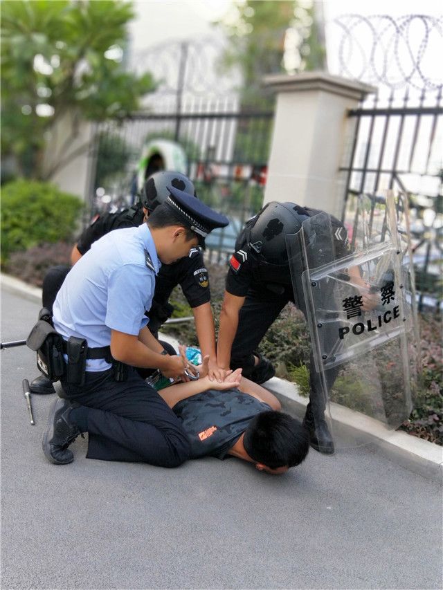 隨后,“接到報警電話”的倉山公安分局巡特反恐大隊(duì)及倉山派出所警察趕到現(xiàn)場,合力制服“歹徒”,將“歹徒”押上了警車。