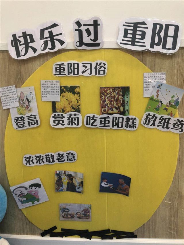 重陽節(jié),又稱“踏秋”,慶祝重陽節(jié)一般會包括出游賞景、登高遠眺、觀賞菊花、遍插茱萸、吃重陽節(jié)糕、飲菊花酒等活動。老師們貼心地通過插畫、解說等方式,讓孩子們了解重陽節(jié)的習俗,拉近生活與傳統(tǒng)文化的距離,也為后續(xù)的活動做好準備。