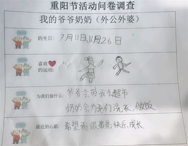 大多時候,孩子們的爸爸媽媽需要上班,接送他們上下學及日常生活的“工作”就落在了老人身上:爺爺(外公)陪孩子寫字、畫畫、下棋、玩游戲......奶奶(外婆)給孩子洗衣、做飯、帶孩子去跳“廣場舞”.....