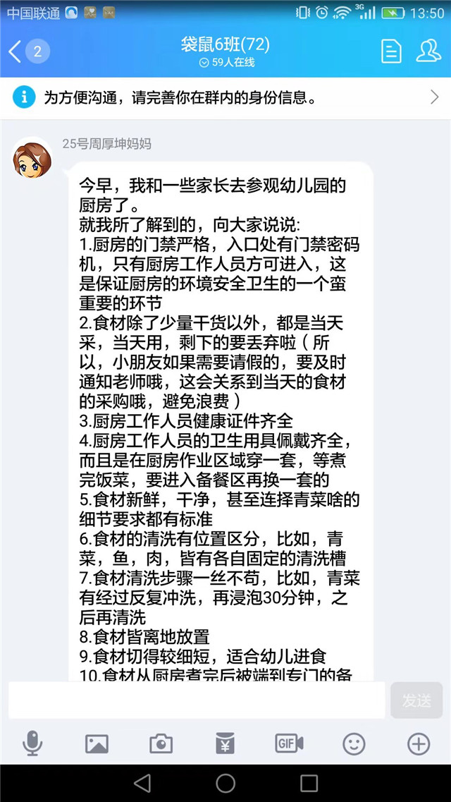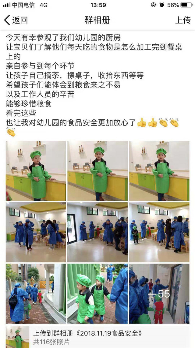 作為各班的家長(zhǎng)代表,參加完活動(dòng)后,還在各班的群里向未到場(chǎng)的其他家長(zhǎng)們匯報(bào)了自己參觀后廚的真實(shí)情況及感想,照片、文字、視頻應(yīng)有盡有。幼兒的飲食安全一直是園所極為重視的內(nèi)容,對(duì)待每一餐、每一食物,園所都精心搭配、用心制作,確保幼兒在校園的健康成長(zhǎng)。