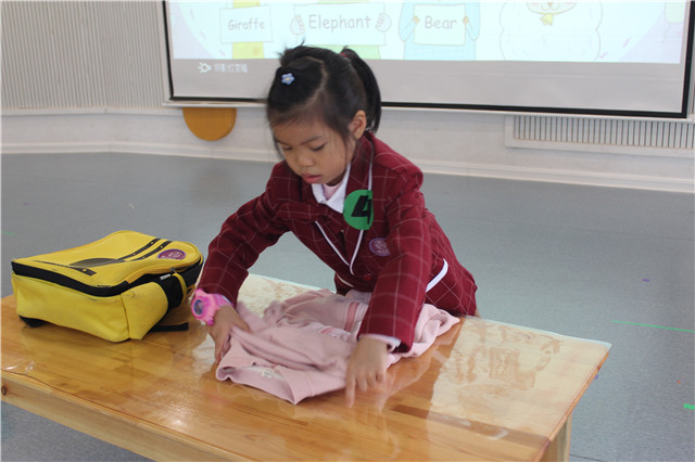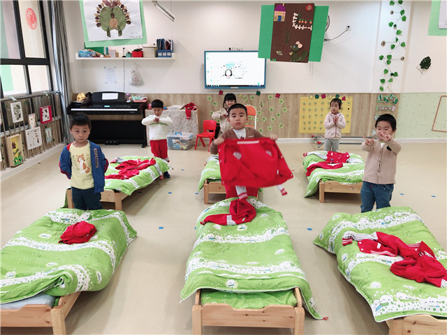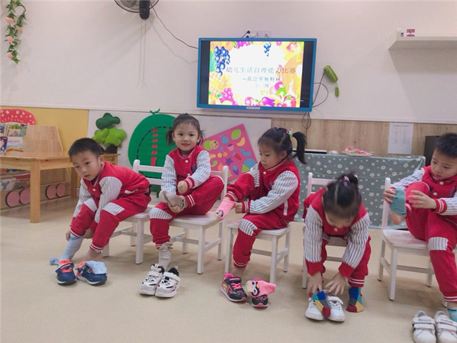 比賽內(nèi)容根據(jù)幼兒的年齡特點(diǎn)設(shè)置:小班段穿鞋、襪;中班段疊衣服、被子;大班段整理書(shū)包。