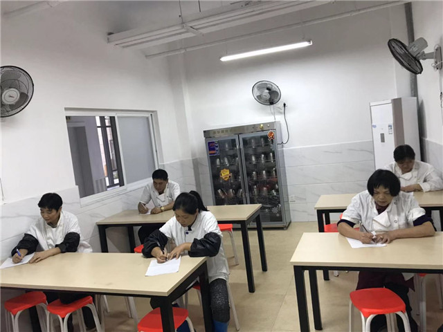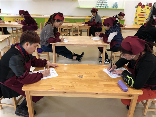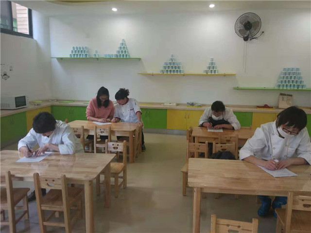 后廚人員的考核則是通過(guò)筆試考核了大家對(duì)餐具的清消標(biāo)準(zhǔn)流程和蔬菜清洗、切配流程,確保每一位后廚工作人員都能細(xì)致化、標(biāo)準(zhǔn)化地對(duì)待每一件工作。