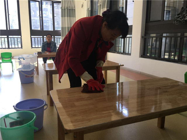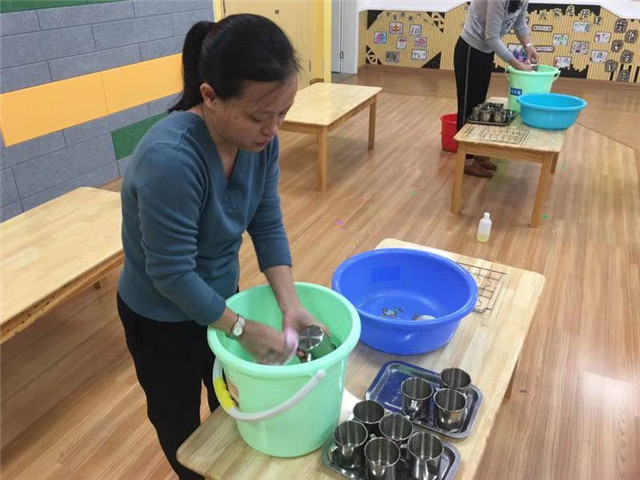 而技能實(shí)操的考核共有四項(xiàng)內(nèi)容,分別是:桌面消毒、清洗水杯、餐具擺放、疊毛巾。每項(xiàng)考核內(nèi)容都是保育員日常所接觸的工作,如何在規(guī)范化的前提下,將這些工作做得更精更好是每一位保育員的追求。